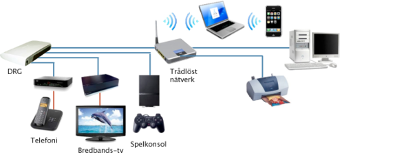 Koppla tv-boxen till DRG:n med en vanlig nätverkskabel (Ethernet). Från tv-boxen ansluter du tvn via Scart, RGB, S-Video eller HDMI (beroende på vilken box du valt och vilken tv du har).